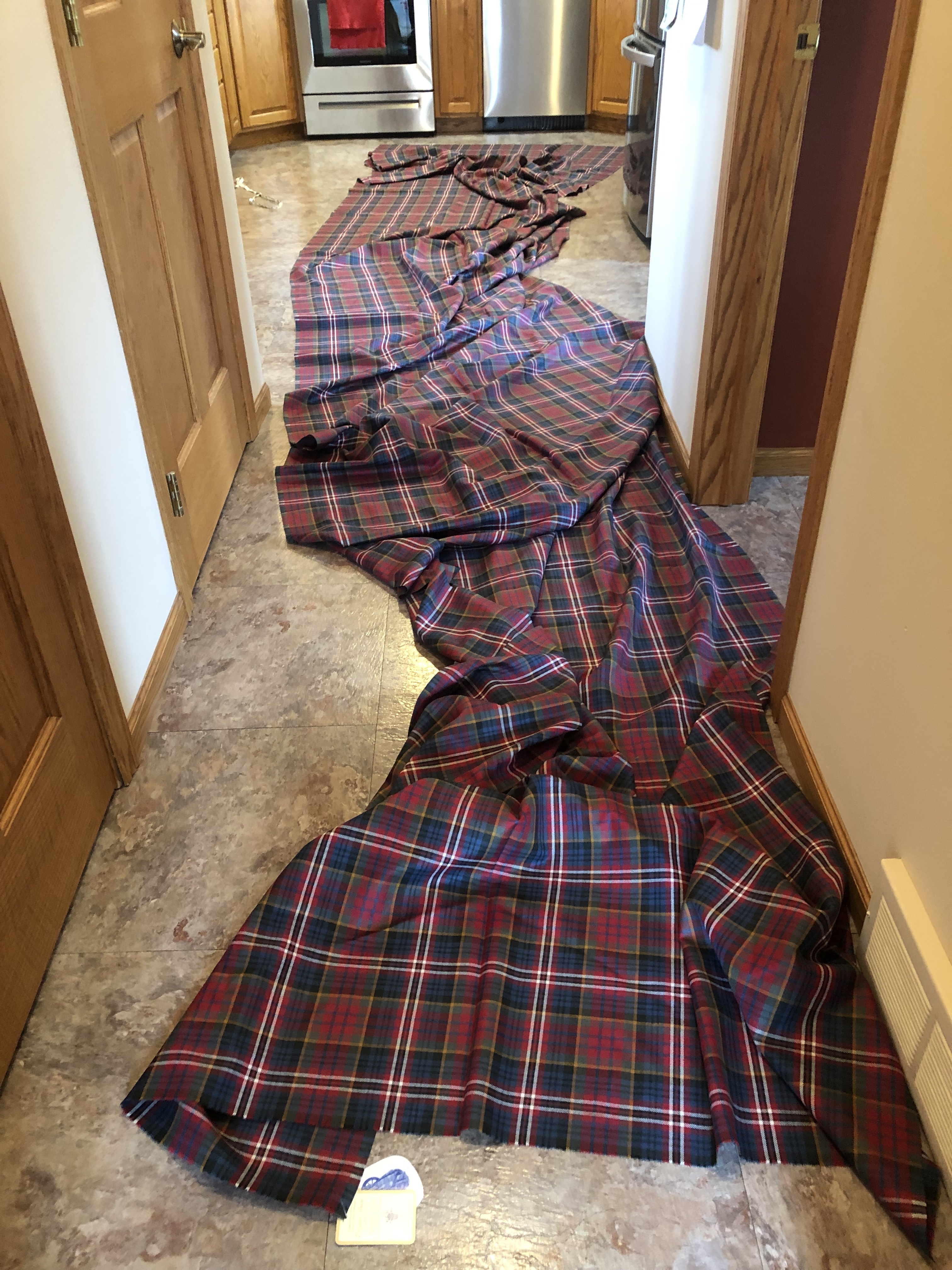 I’m excited! I’m starting a new kilt for my son. I’ll be posting the whole adventure, from fabric to finished swish! The process begins with eight yards of MacPherson Red Muted from Strathmore Woollen Mill in Scotland spread out across the kitchen and into the hallway. So glad I have a long stretch of floor. It makes it easier to do the measuring and mark the pleats.