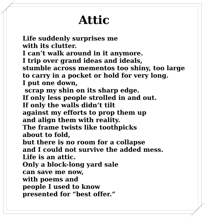 Attic This is an ode to all the things in my head I can’t let go of, even when I know I should. “Attic” copyright © 2019 by Danith McPherson Share this: Click to share on X (Opens in new window) X Click to share on Facebook (Opens in new window) Facebook Click to share on Reddit (Opens in new window) Reddit Click to share on Pinterest (Opens in new window) Pinterest Like Loading...